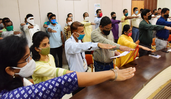कोल्हापूर - जीवनाच्या सर्व क्षेत्रात सत्यता आणि कायद्याच्या नियमांचे पालन करेन, लाच घेणार नाही, लाच देणार नाही सर्व कार्य प्रामाणिपणे आणि पारदर्शीपणे जनहितामध्ये काम करेन,व्यक्तीगत वागणुकीत प्रामाणिकपणा दाखवून उदाहरण प्रस्तुत करेन, भ्रष्टाचाराची कोणत्याही घटनेची माहिती योग्य एजन्सीला देईन,अशी सत्यनिष्ठा प्रतिज्ञा जिल्हाधिकारी कार्यालयातील अधिकारी-कर्मचारी यांनी आज घेतली.