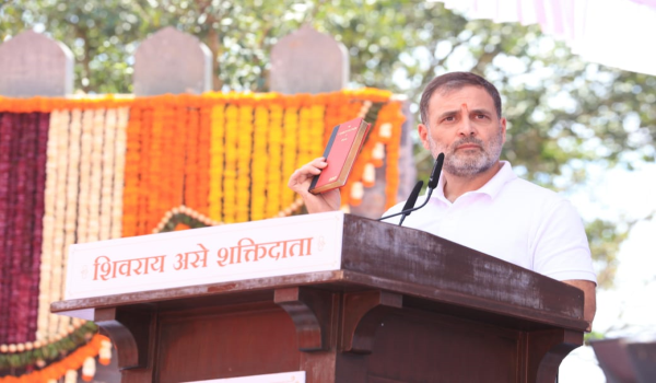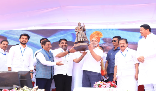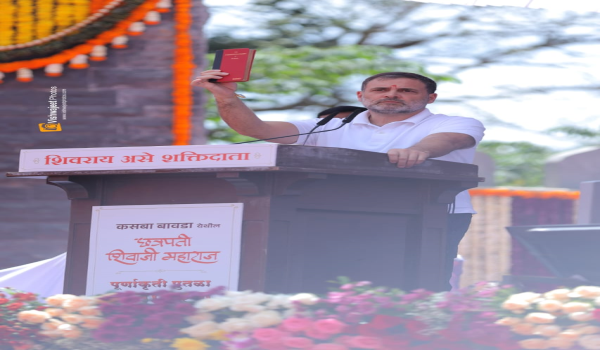 मालवण किना-यावर नौदल दिनी पंतप्रधान नरेंद्र मोदी यांच्या हस्ते अनावरण करण्यात आलेला छत्रपती शिवाजी महाराजांचा पुतळा अवघ्या आठ महिन्यांतच कोसळला.यापार्श्वभुमीवर बोलताना, राहुल गांधी यांनी भाजपचा बुरखाच पाडला.नियत कधी लपवू शकत नाही.त्यांनी छत्रपती शिवाजी महाराजांचा पुतळा बांधला.पण काही महिन्यांनी तो कोसळला.त्यांची नियत चुकीची होती.पुतळ्याने ते संकेत दिले.जर तुम्ही शिवाजी महाराजांचा पुतळा उभारत असाल तर तुम्हाला त्यांच्या विचारधारेचे रक्षण करावे लागेल.पण त्यांची विचारधारा चुकीची असल्याने तो पुतळा पडला .ते शिवाजी महाराजांसमोर हात जोडतात आणि २४ तासांतच शिवाजी महाराजांच्या विचारांविरोधात काम करतात.शिवाजी महाराजांचा राज्याभिषेक होऊ दिला नाही.नवीन संसद तसेच राम मंदिराच्या उद्घाटनात आदिवासी राष्ट्रपतींना जावू दिले नाही.या विचारधारा एकच आहेत.विचारधारेत फरक नाही.त्यामुळे आपली ही राजकीय लढाई नसून, शिवरायांच्या विचारधारेची संविधानाची लढाई आहे,असेही ते म्हणाले