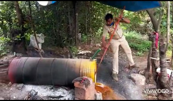 पोलिसांनी दिलेल्या माहितीनुसार,नांदारी (ता. शाहूवाडी) येथील सरकारी जागेतील ओढा परिसरात गावठी दारू निर्मितीची हातभट्टी सुरू असल्याची गोपनीय माहिती मिळाल्यानंतर शाहुवाडीचे सहायक पोलिस निरीक्षक भालचंद्र देशमुख यांनी निर्भया पथकप्रमुख एपीआय शैलजा पाटील, व अन्य कर्मचाऱ्यांना सोबत घेऊन या हातभट्टीच्या ठिकाणी छापा टाकला. यावेळी बबन आनंदा इंगळे हा स्थानिक संशयित आरोपी येथील ओढ्याकाठी जळत्या चुलीवर पत्र्याच्या बॅरेलमध्ये कच्चे रसायन उकळून अवैधरित्या गावठी दारू तयार करीत असताना आढळून आला.
